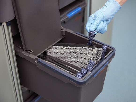 - Bandeja perfurada para a preparação e dosagem uniforme de mopas e panos.